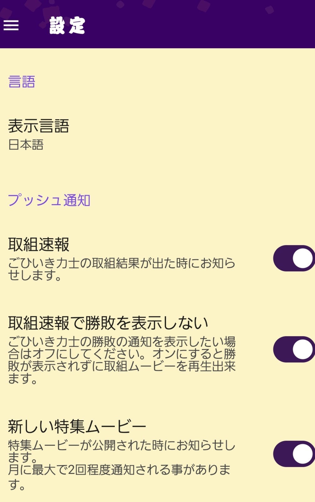 ごひいきに登録した力士は取組速報のプッシュ通知が受け取れます。